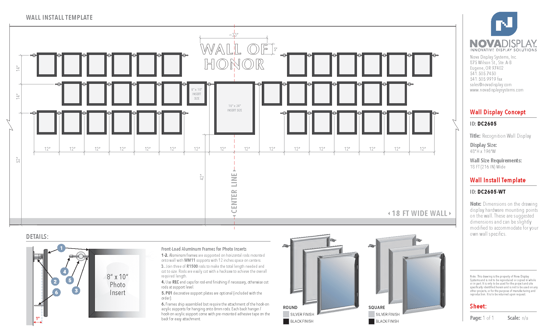 Recognition Wall Display / Wall of Honor represents an innovative and versatile visual communication solution, featuring aluminum snap-open front-load frames designed to accommodate both 8″ x 10″ photographic inserts and expansive 18″ x 24″ informational posters. Meticulously crafted for professional environments, this modular display system offers unparalleled flexibility through its sophisticated rod mounting mechanism, utilizing 6mm horizontal stainless steel rods that can be seamlessly interconnected to create extended display lengths. The frames, available in elegant round or square profile designs and finished in contemporary silver or sleek black, enable effortless rearrangement and quick content updates, making them ideal for corporate settings, educational institutions, and public spaces seeking a dynamic and sophisticated method of showcasing achievements, certificates, and important documents. Complemented by premium brass wall mounts in a refined satin chrome finish and constructed with durability and aesthetic appeal in mind, this display system combines functional engineering with sophisticated design, ensuring a professional and visually compelling presentation that can be easily customized to meet diverse organizational communication needs. *Select frame profile style and finish type on the product page.