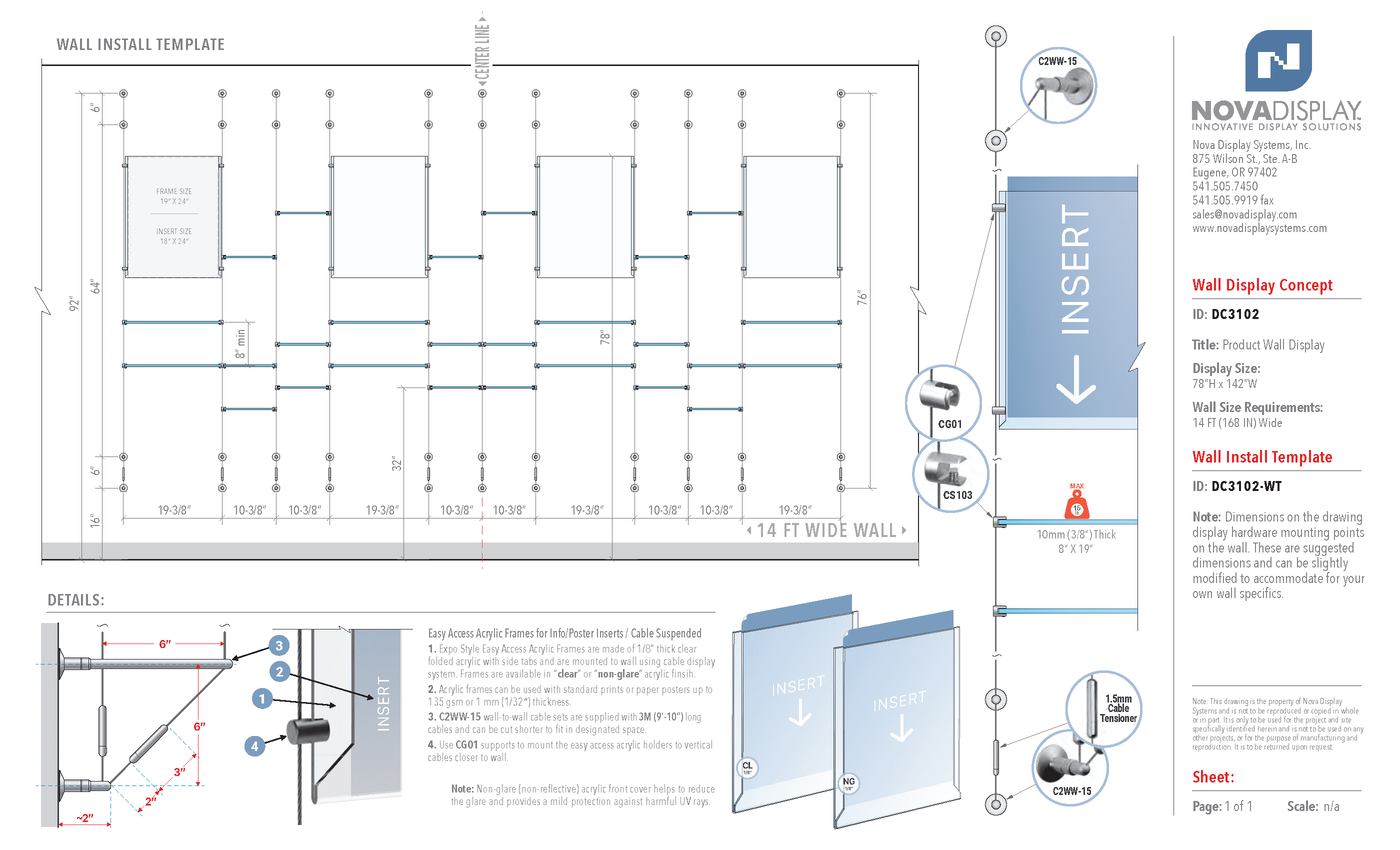 Product Wall Display – incorporates acrylic easy access holders for 18” x 24“ info/poster inserts and 19“ x 8” / 10“ x 8” deep acrylic shelves suspended with wall-to-wall cable display system. The 1.5mm cable suspension system comes in a double-cable kit assembly. The cables are elegant and obscure, yet incredibly strong. The floating on cable acrylic shelves are fully adjustable. Use to display collectibles, promotional products, or other lightweight merchandise. Display comes with cable suspension components made of brass with satin chrome finish, clear acrylic shelves with flat polished edges, and clear or non-glare (non-reflective) acrylic frames. *Select acrylic finish type on the product page.