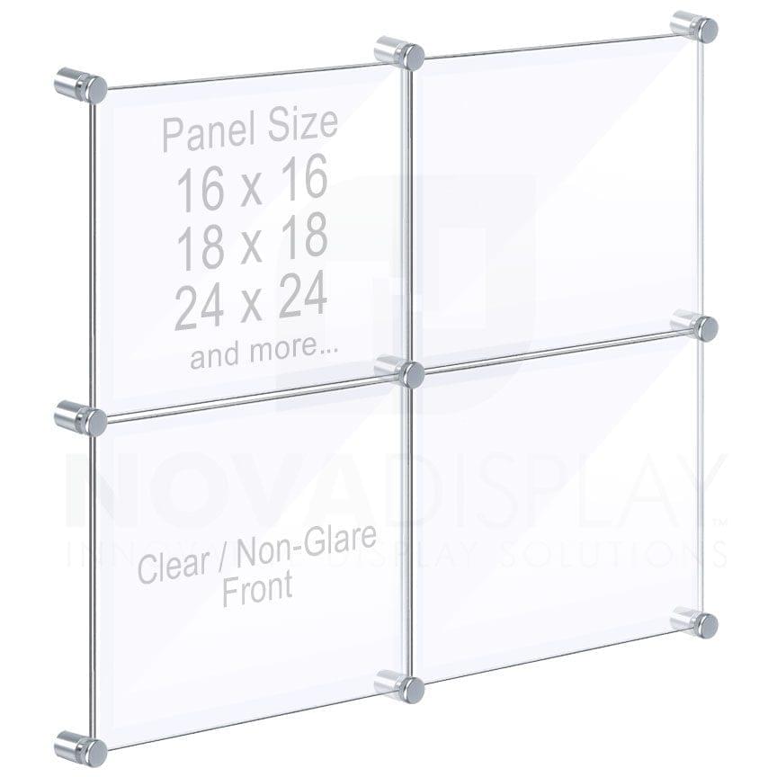 FINISHES: Mounting Hardware is supplied in a satin chrome finish as standard, other finishes on request. The Frameless Graphic Panels are made of high-quality 1/8″ thick clear and 1/8″ non-glare acrylic.