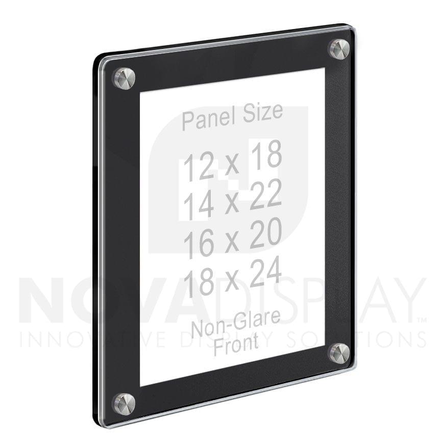 Black Acrylic Frame/Standoff Hardware Bundle: Includes 1/4″ Black Matte Acrylic Back Panel (4 ea), 1/8″ Non-Glare Acrylic Front Panel (4 ea), and Stainless Steel Standoff/Drywall Anchor Hardware (16 ea). Use for displaying documents, certificates, photos, signs, or other interchangeable printed inserts in either portrait or landscape orientation. Provides a quick and easy way to change information. Available Insert Sizes: 8.5″ x 11″, 9″ x 12″, 11″ x 14″, 11″ x 17″, 12″ x 18″, 14″ x 22″, 16″ x 20″, and 18″ x 24″.