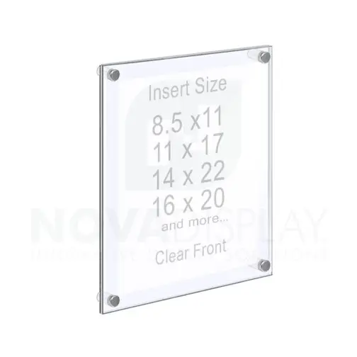 Use for displaying art, documents, certificates, photos, posters, or other interchangeable printed inserts in either portrait or landscape orientation. Provides a quick and easy way to change information. Standoff wall mounts and hardware are included.