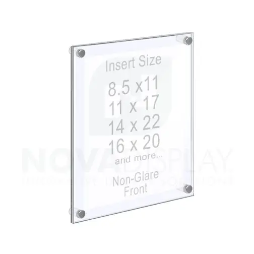 Use for displaying art, documents, certificates, photos, posters, or other interchangeable printed inserts in either portrait or landscape orientation. Provides a quick and easy way to change information. Standoff wall mounts and hardware are included.