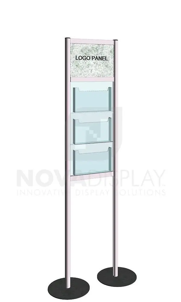 Stack-on Display Stand / ST Series with custom logo panel, three acrylic dispensers for 11″W x 8.5″H letter-sized brochure inserts in single or double-sided configuration.