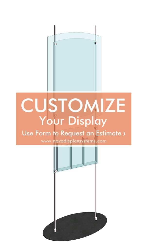 Totem Display Stand / RS Series comes with rods, support fittings, oval base, 11″x14″ poster holder / portrait format, and acrylic dual tri-fold dispenser available in Single or Double Sided configurations.