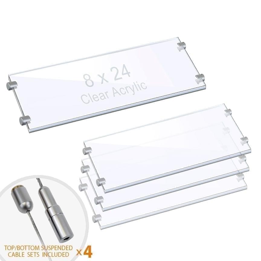 Shelf Display/Hardware Set: Includes Acrylic Shelves (4 ea), Top/Bottom Cable Suspension Hardware (4 ea), and Cable Shelf Supports (16 ea). Use to display collectibles, promotional products, or lightweight merchandise. Available in Clear Acrylic or Frosted Acrylic. Shelf Size: 24″W x 8″D.