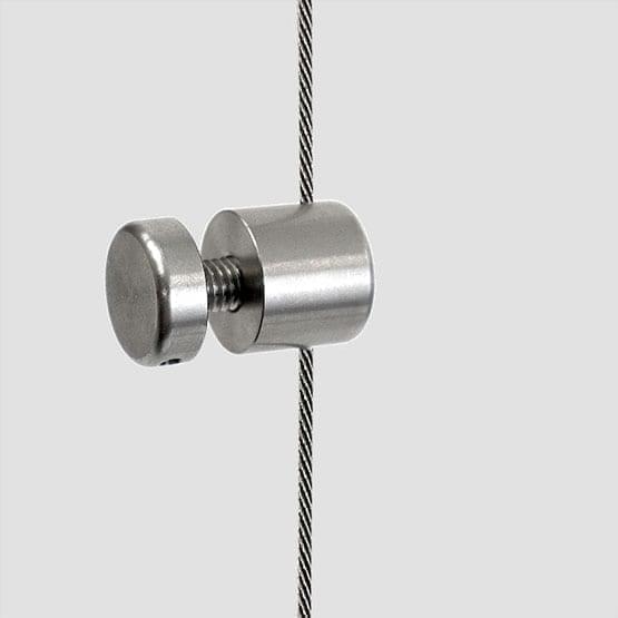 The CP108/SS cable standoff support features a 16mm (5/8″) diameter round profile fitting with an M6 stud-cap, designed for suspending medium to large-sized drilled panels 6-7mm (15/64”-1/4″) thick or a combination of two panels 3mm (1/8″) thick each. This high-quality single-sided panel display standoff is made of solid stainless steel and is compatible with our