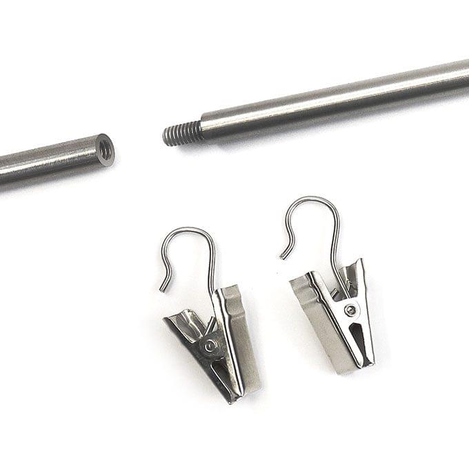 The wall-mounted horizontal rod display kits come with 6mm (1/4″) diameter non-threaded rods in lengths of 0.5m (1′ 7-11/16”), 1.0m (3′ 3-3/8”), or 1.5m (4′ 11-1/16”). Each kit includes a number of RS03/P02 rod wall supports, P50-TWL wall anchors, REC decorative end caps, and PCL/H metal clips with hanging hooks. For projects requiring longer lengths, you may purchase two or more kits with threaded rods. You can join as many of these kits as needed and finish the rod ends or cut rods to the required size. Rods project from the wall 10mm (3/8″) on center.