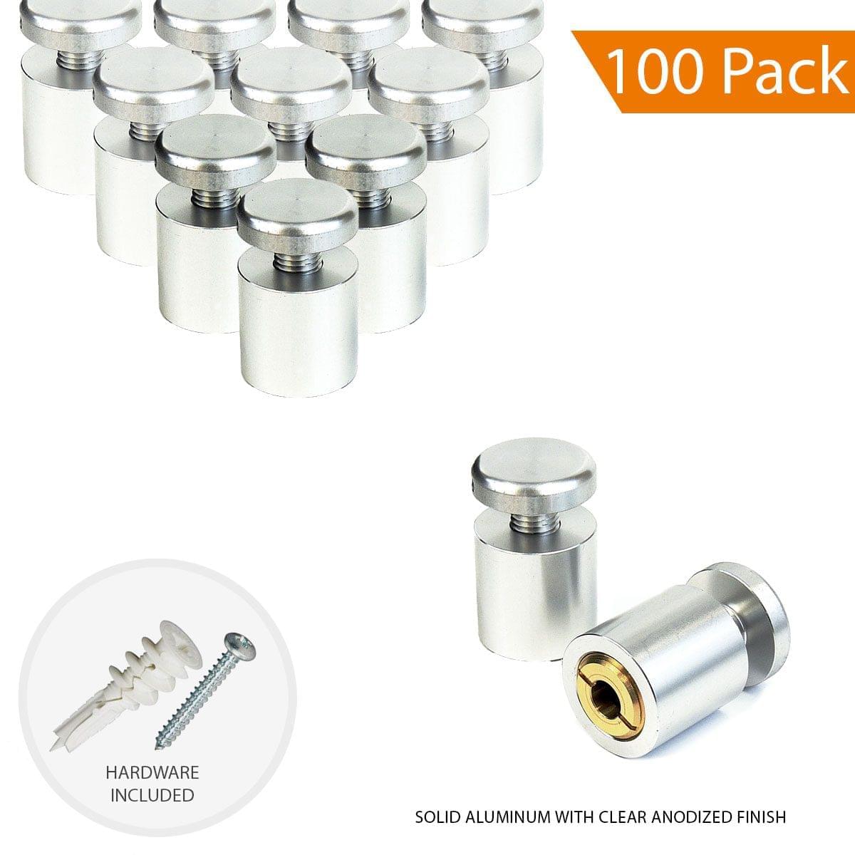 Sign Standoff/Hardware Kit: 3/4″ Dia. x 3/4″ Sign Standoff with Wall Plug and Twist-N-Lock Anchor / Pack of 100 units. Made of Solid Aluminum with Clear Anodized Finish.