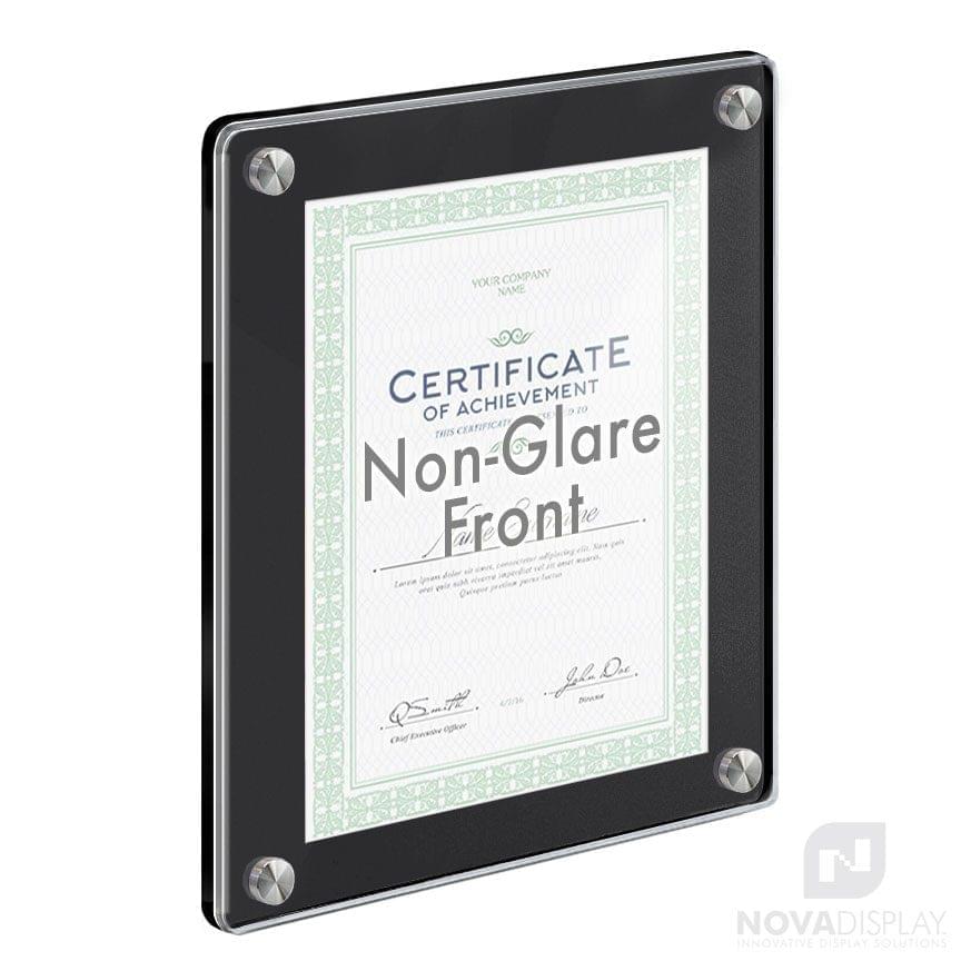 FINISHES: Mounting Hardware is supplied in a satin brushed stainless finish as standard, other finishes on request. The Acrylic Frames are made of high-quality 1/4″ thick one-sided black matte back and 1/8″ thick non-glare front.