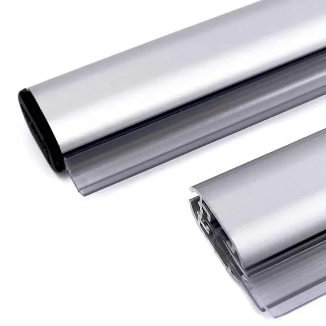 Quick-Snap Aluminum Graphic Gripper for 18″ to 48″ wide graphics. Price includes one holder (crossbar) with end caps for both ends – you will need two holders (top and bottom) to hang a graphic. Use with Wall Hangers or Cable Hardware for Ceiling Suspension. Sold separately.
