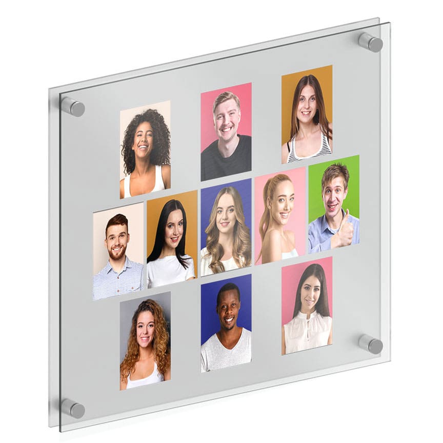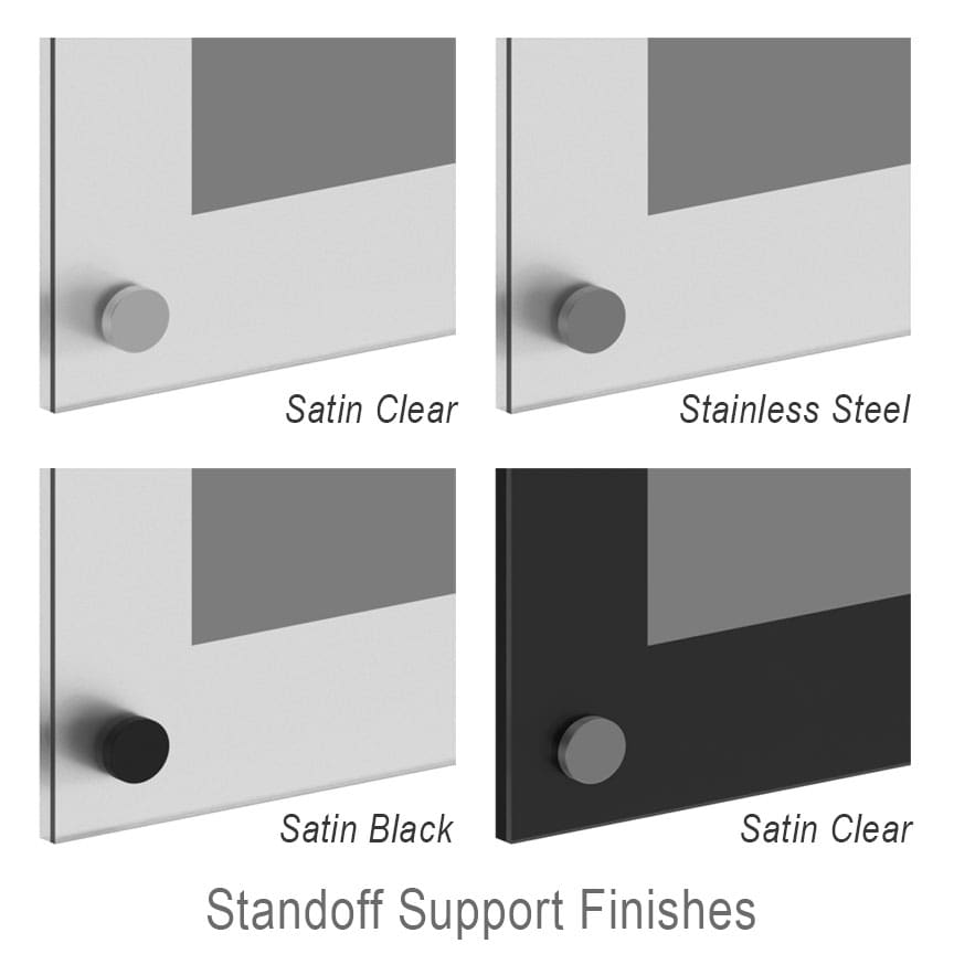 FINISHES: Mounting hardware is supplied in satin clear, satin black, or stainless steel finishes. The acrylic backboard is made of 1/4″ thick acrylic and is available in a few finish options, such as clear, frost matte, white matte, or black matte. The acrylic cover/frame set is made of quality 1/8″ thick clear and non-glare (non-reflective) acrylic.