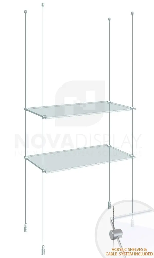 Supplied with 1.5mm cable suspension hardware: ceiling-to-floor cable fixings, cable clamp supports for shelves, and colorless clear acrylic shelves with polished edges. Use to display collectibles, promotional products, or lightweight merchandise.