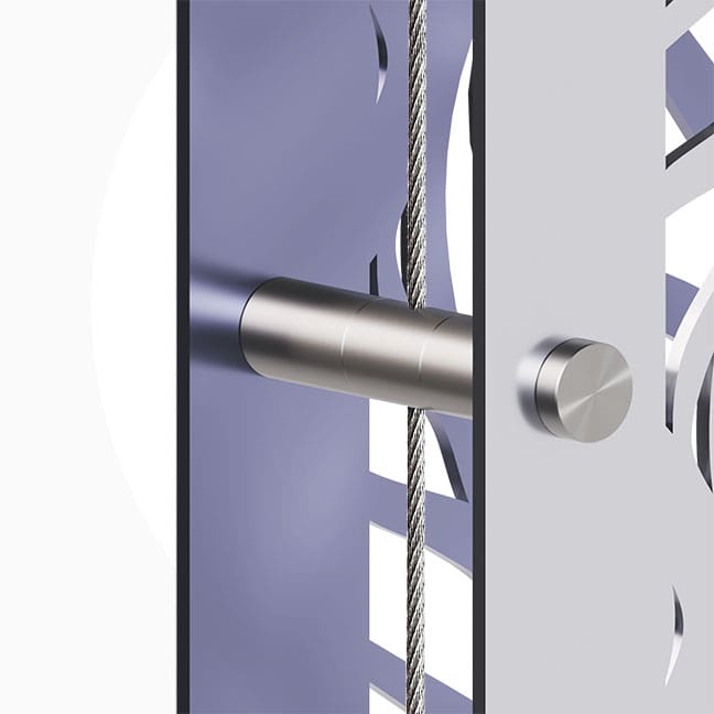 These dual-grip cable standoffs feature wide projections, ideal for creating suspended double-depth or double-sided ornamental screens. They securely support two screens on a single cable, enhancing design flexibility for architectural and decorative applications. Constructed from durable materials for reliable performance in both indoor and outdoor installations.