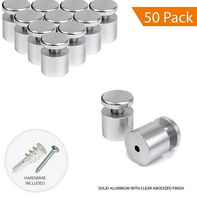 Sign Standoff/Hardware Kit: 1″ Dia. x 3/4″ Sign Standoff with Twist-N-Lock Anchor / Pack of 50 units. Made of Solid Aluminum with Clear Anodized Finish.